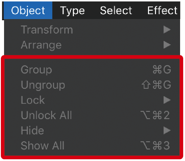 Once you’ve deleted the layer, you can check to make sure there are no other locked (or hidden) layers in your artwork. Select the Object menu up top, and look over the highlighted section below. If all the options are grayed out, that means there are no more hidden surprises in your data.