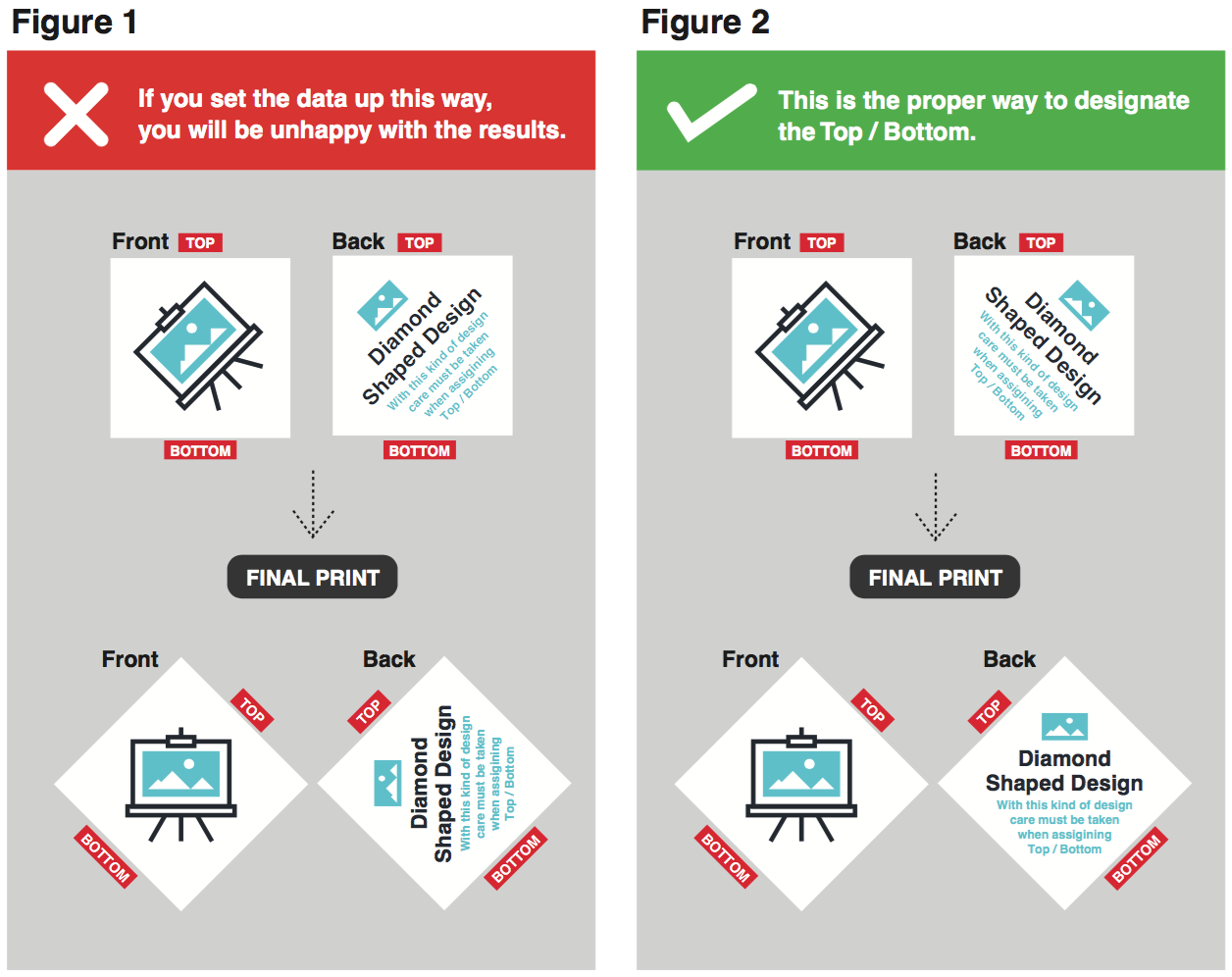 As shown in Figure 1, if you specify top and bottom when the direction of the design are both facing the same way, the front and back sides will not match when printing.
