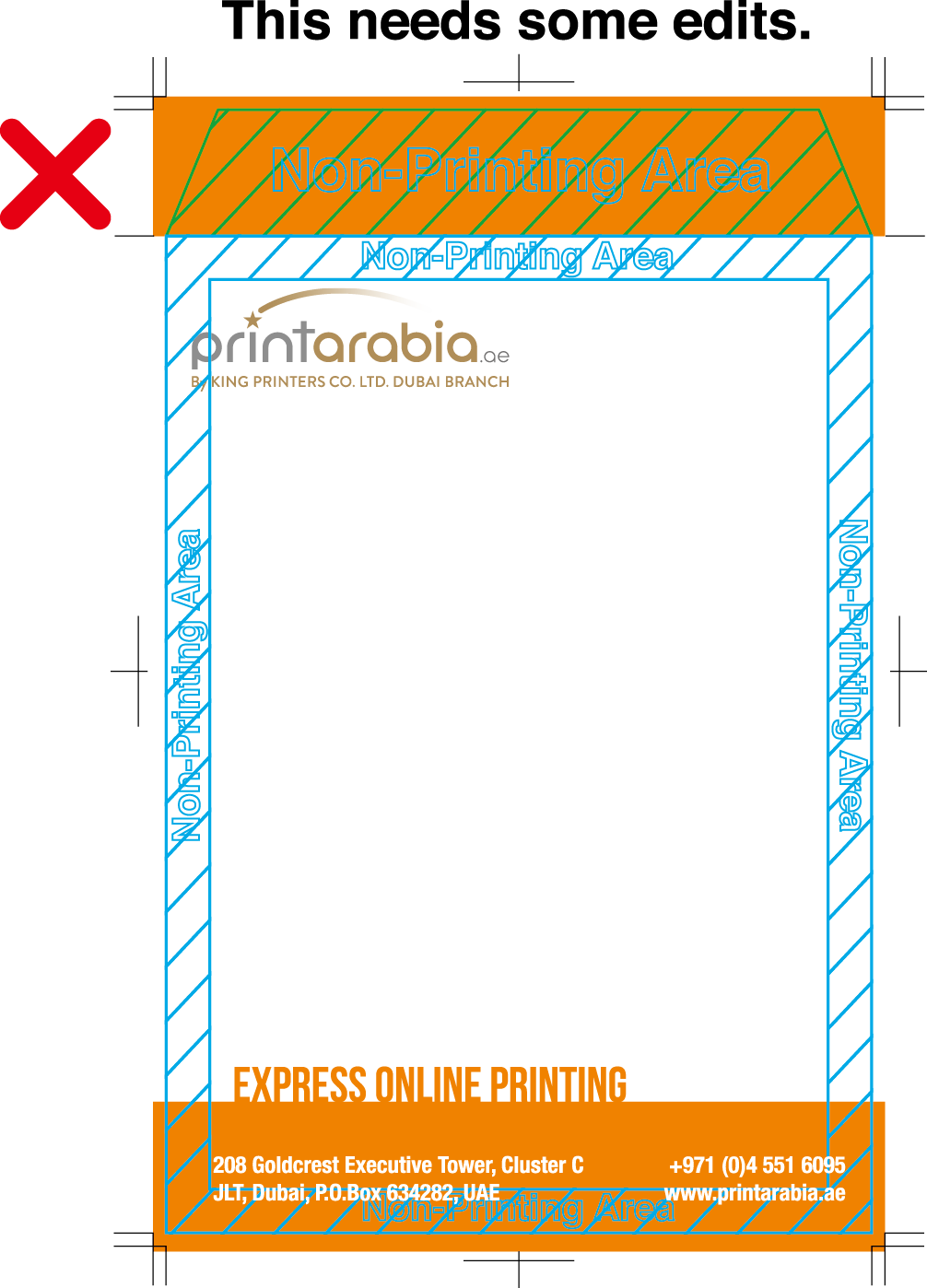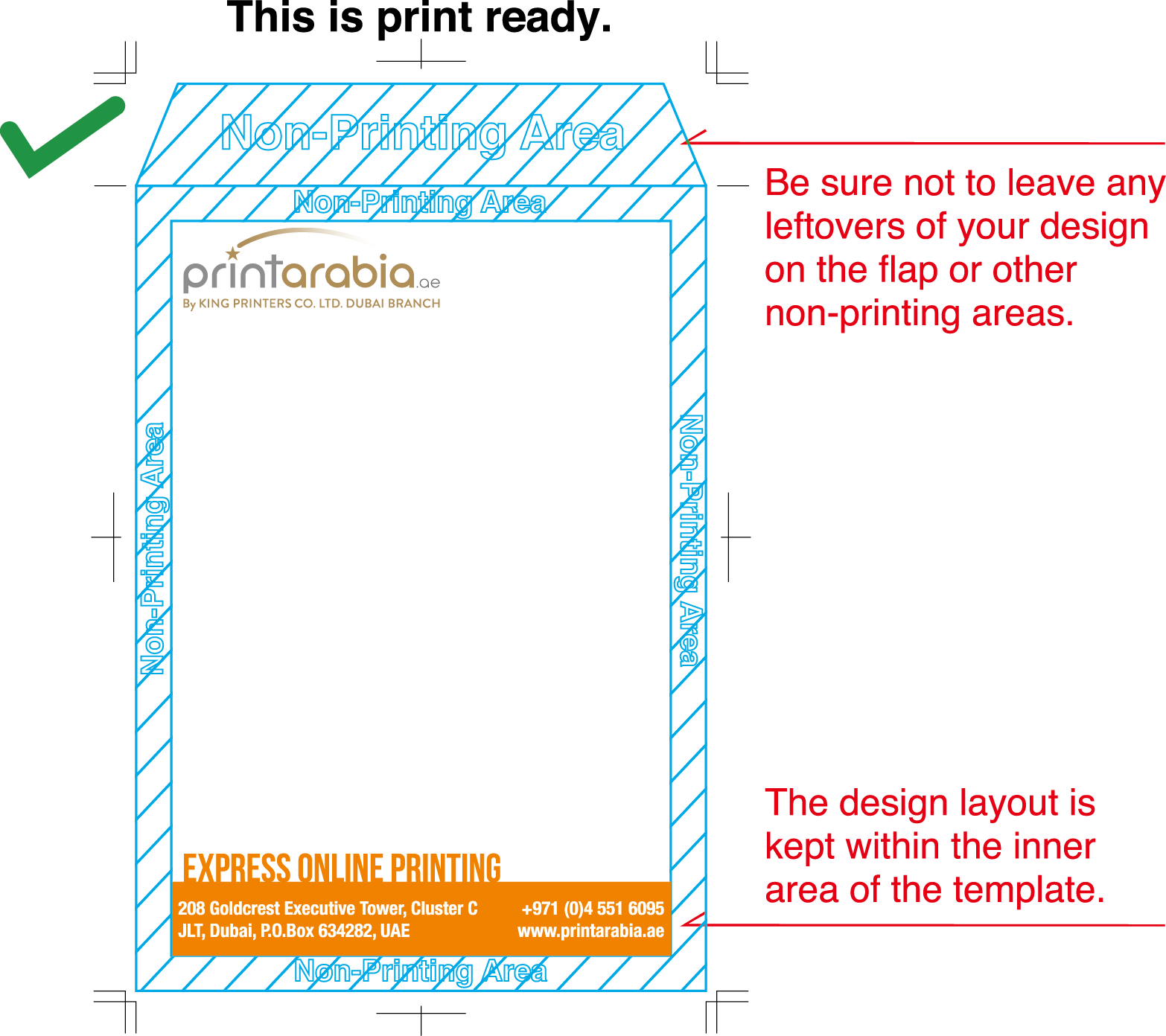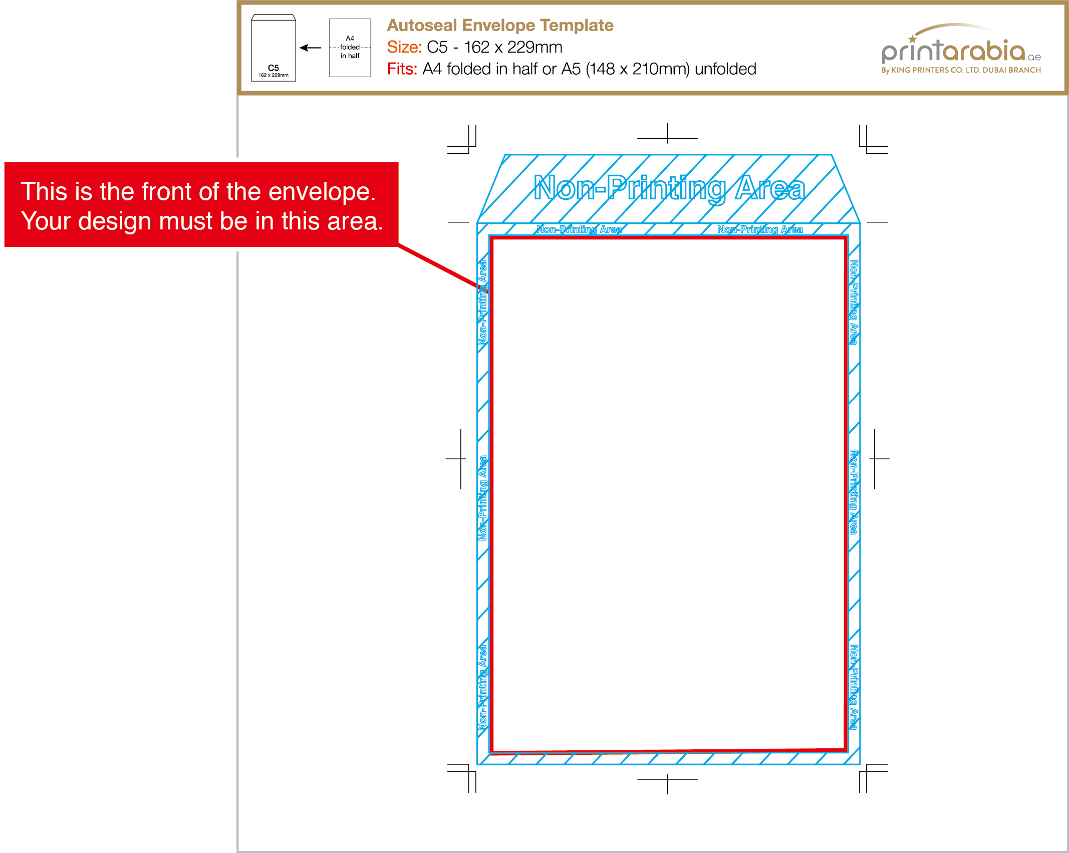 Marked in blue below, you can see the non-printing zone. The front side of the envelope has a 5mm margin on all sides which cannot have any designs on top, so your design must be kept inside of the white area highlighted in red below.