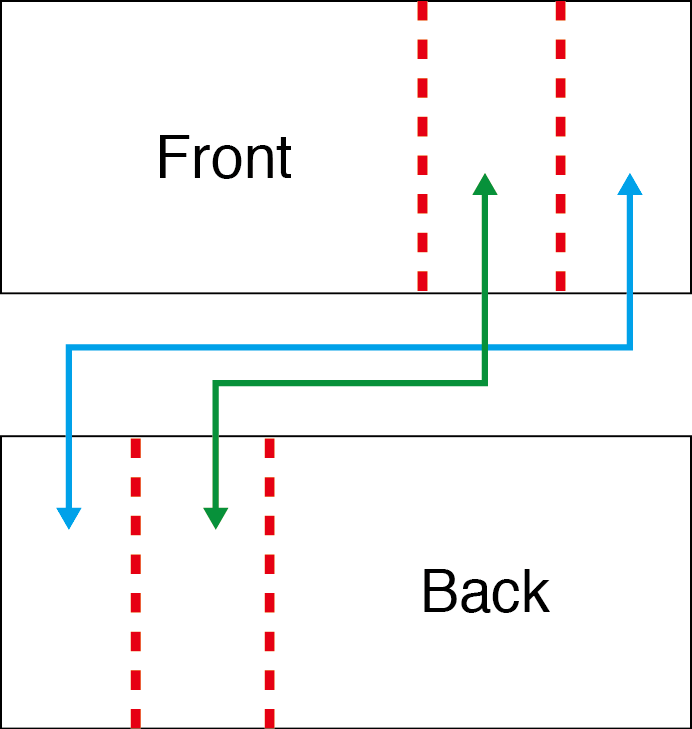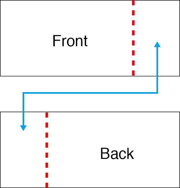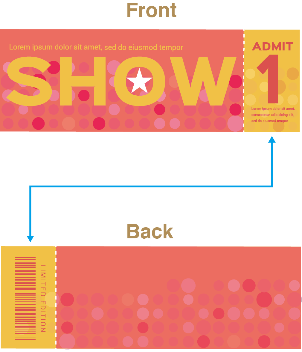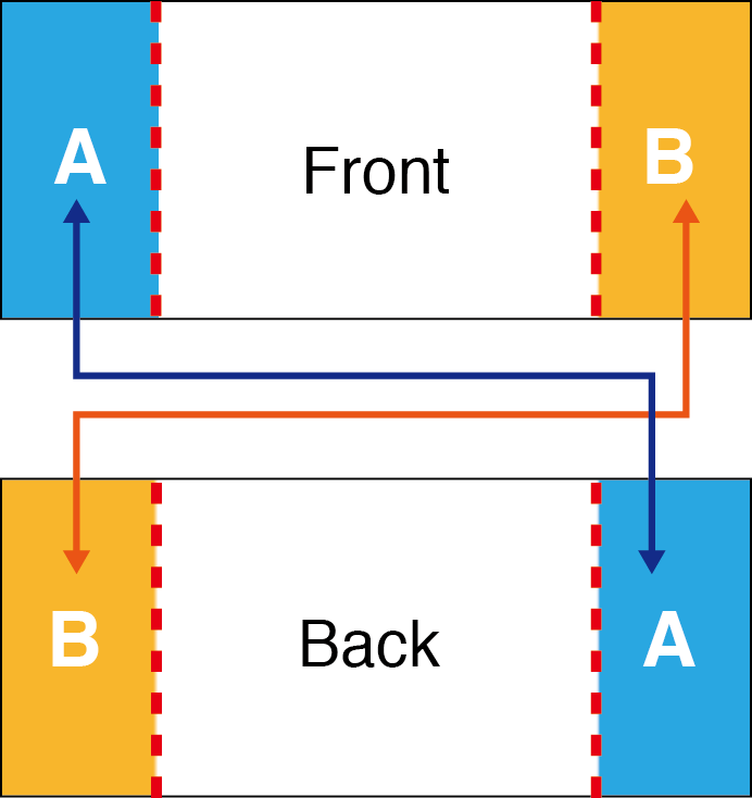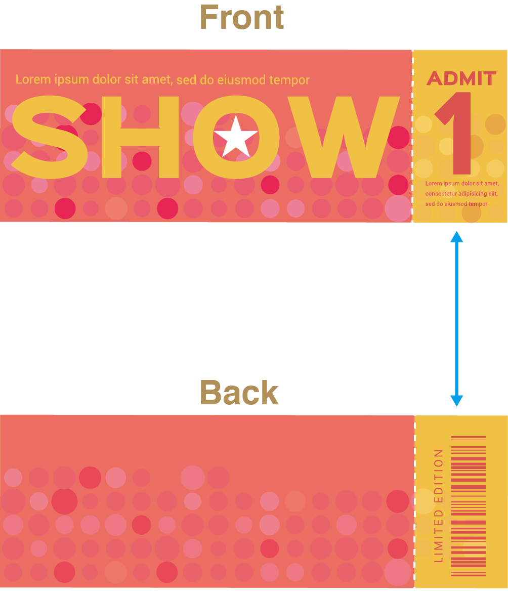 A common mistake when setting up ticket artwork with perforations is the positioning of the artwork for the front side and the back side are the same. When preparing your artwork it is important to remember that printing sheets are turned over horizontally (left to right),in the same manner you would turn the pages of a magazine or catalog.